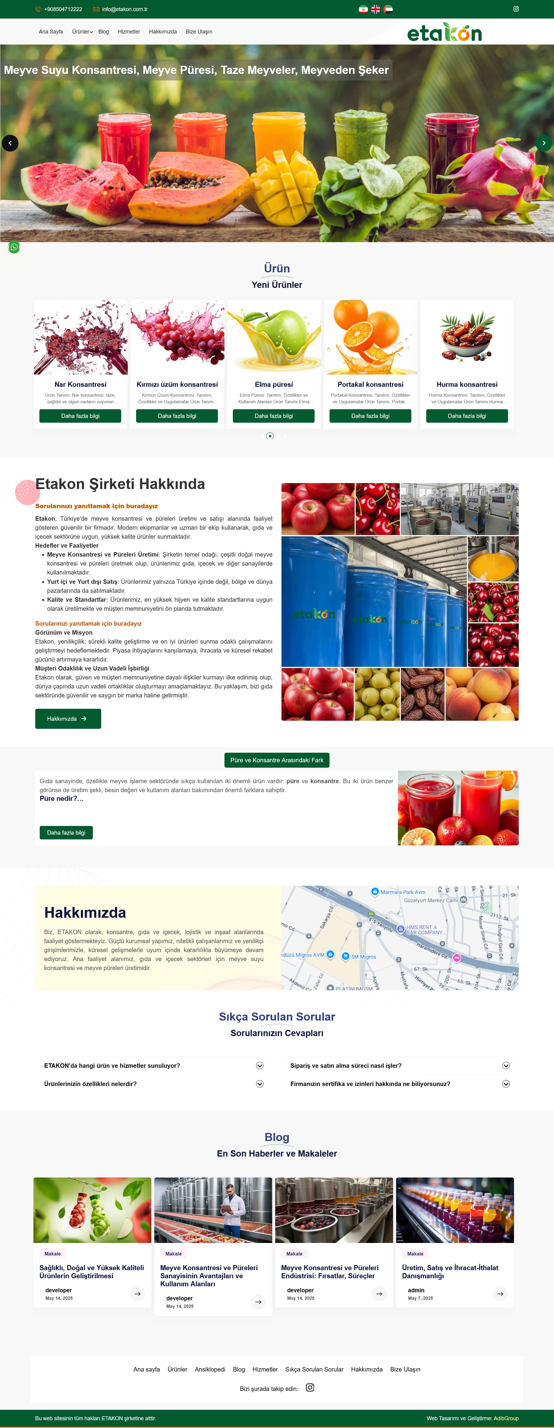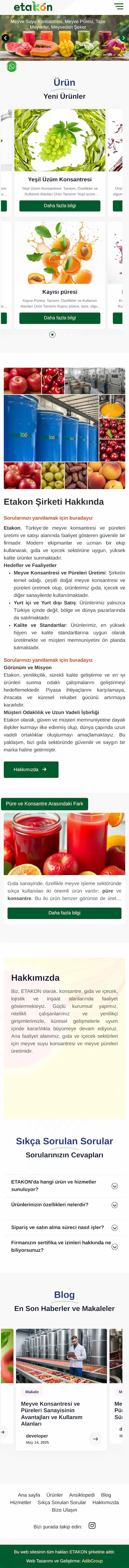 Etakon یک شرکت ترکیهای است که در زمینه تولید «کنسانتره میوه» (fruit concentrate) و «پوره میوه» فعالیت میکند و دفتر مرکزی شرکت در استانبول قرار دارد. آنها تأکید زیادی روی کیفیت بالا محصولات، استانداردهای بهداشتی بینالمللی و تولید با تجهیزات مدرن دارند.